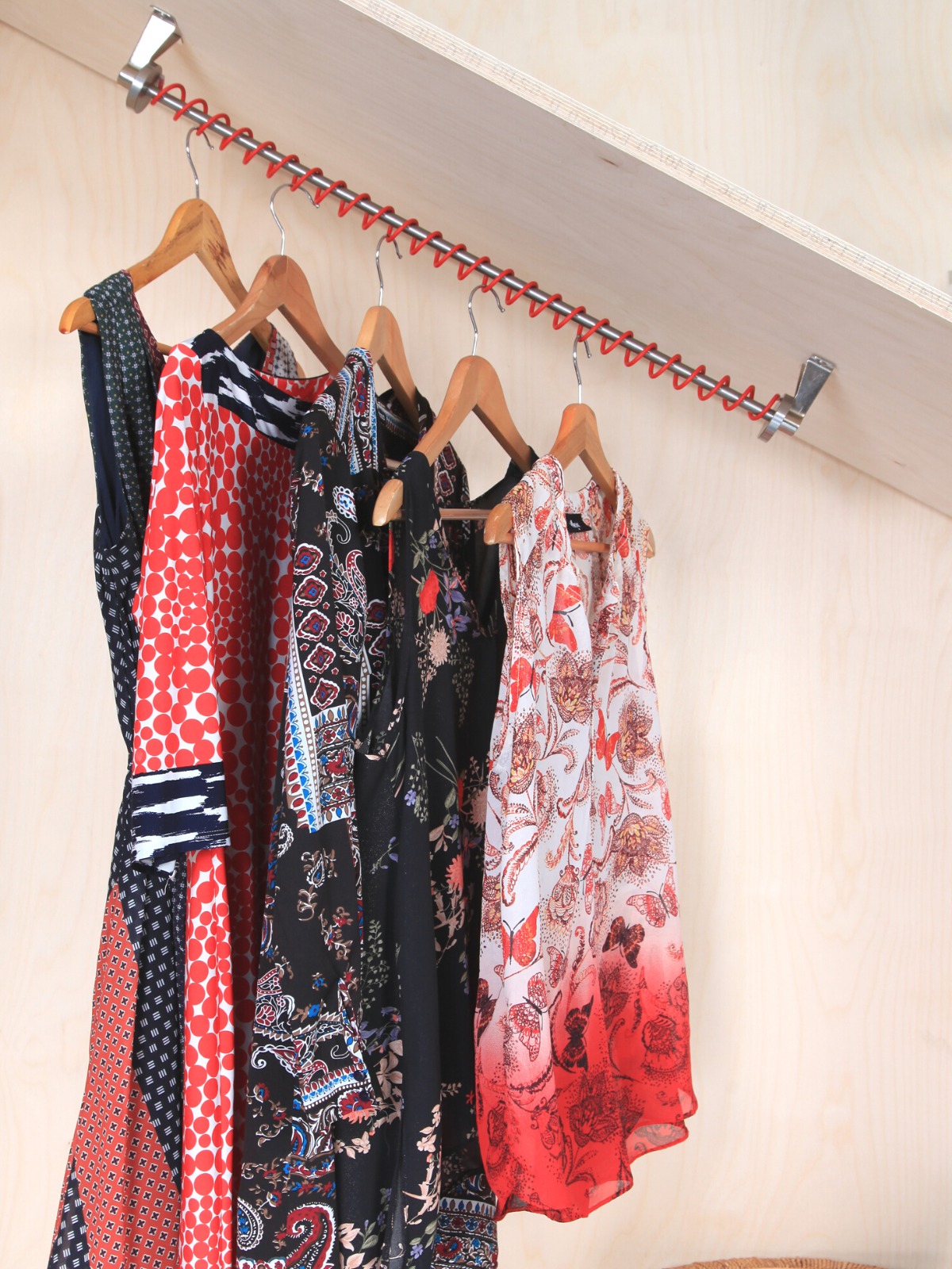 Durable, dynamic, and designed to hold your clothes securely at any angle, Zebedee Red brings energy and flair to your interior.